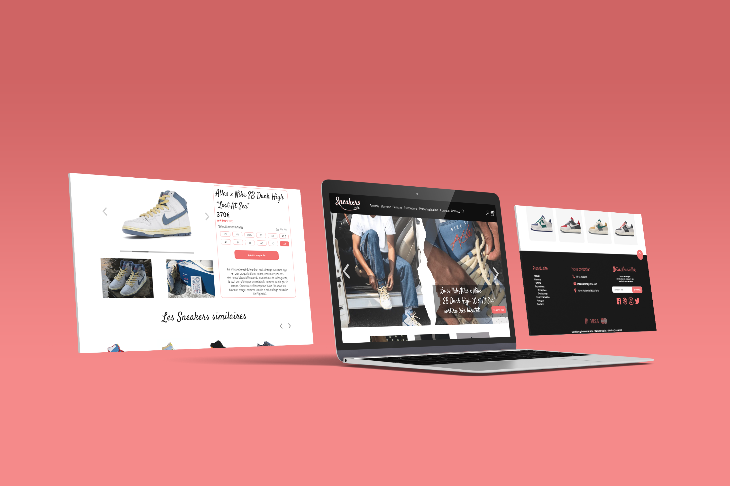 Ce projet est issu d’un cours de Webdesign lors de ma licence professionnelle. L’objectif était de réaliser une maquette de site e-commerce de vente de Sneakers. Étant amateur de sneakers depuis déjà quelques années, le projet m'intéressait tout particulièrement. Plus tard j’ai également fait l’intégration de la page d’accueil en html/css avec le framework bootstrap.Ce projet m’a permis de progresser sur Adobe XD et en webdesign. Pour ce qui est des choix graphiques, j’ai opté pour un usage de peu de couleurs car le site se retrouverait vite surchargé si ma palette était trop fournie étant donné que les paires de sneakers mis en valeur sur le site sont souvent très colorées. Pour trouver ces couleurs, je me suis inspiré d’une paire de sneakers dont je rêve depuis longtemps à savoir la Nike SB Dunk High Atlas Lost at Sea. C’est notamment le rose que l’on retrouve sur la languette qui a donné la couleur principale de cette charte graphique.